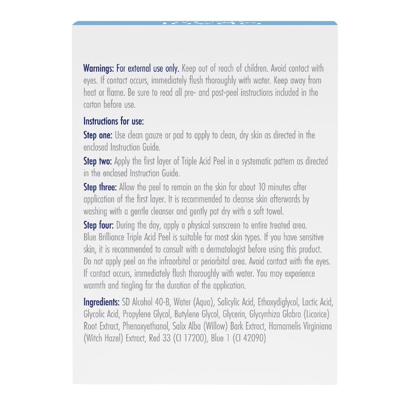 Bộ peel da tại nhà Obagi Clinical Blue Brilliance Triple Acid Peel với công thức peel da độc đáo kết hợp 3 loại acid để tác động chuyên sâu lên cấu trúc da, đem lại làn da mềm mại, cải thiện kết cấu nền da sáng mịn, đều màu hơn. Nhờ công nghệ điều chế, phối hợp giữa 3 loại acid, bộ peel da Obagi Clinical Blue Brilliance Triple Acid Peel an toàn và dễ dàng để sử dụng peel da tại nhà.